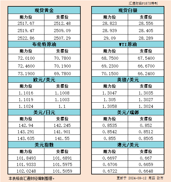 汇通财经APP讯——9月12日美市黄金、白银、原油、美元指数、欧元、英镑、日元、瑞郎、澳元支撑阻力位一览。