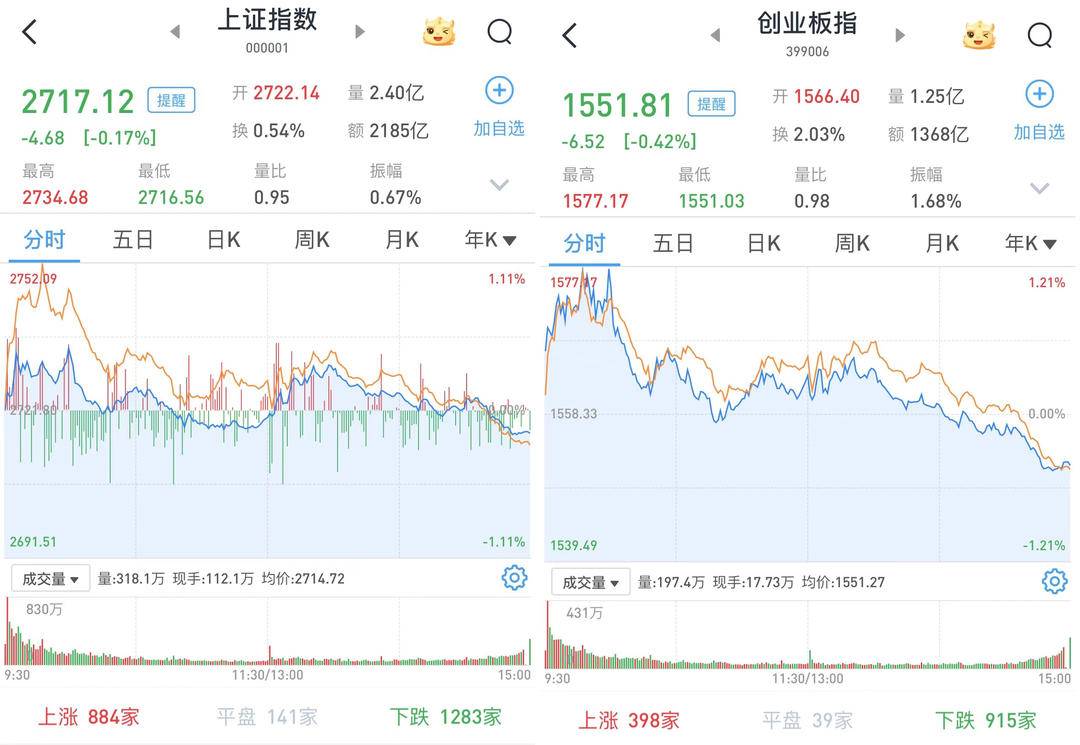 至收盘,上证综指跌0.17%,报2717.12点;科创50指数跌0.82%,报658.85点;深证成指跌0.63%,报8054.24点;创业板指跌0.42%,报1551.81点。