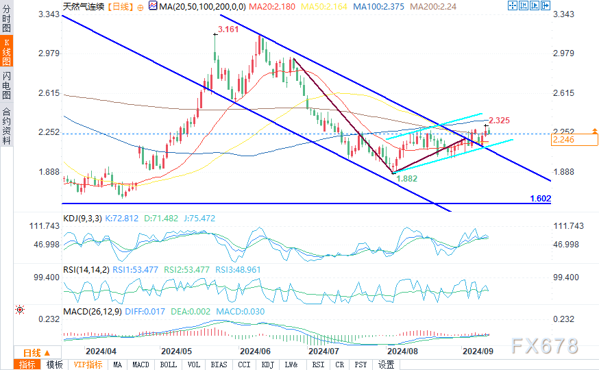 天然气价格成功突55日均线,触及第一个目标位2.340美元,这里是50%斐波那契修回撤所在位置。