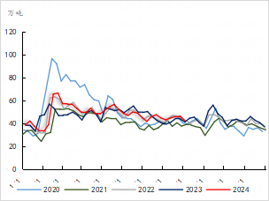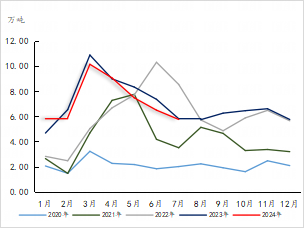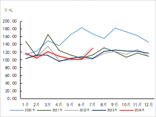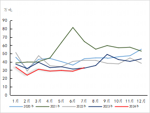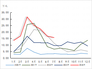 2024年1-7月我国聚乙烯累计出口量在50.79万吨,同比-3.70%。7月份我国聚乙烯出口量在5.76万吨,同比-1.88%,环比-11.49%;2024年7月份我国聚丙烯出口量在15.70万吨,环比-6.49%,2024年1-7月累计出口量在141.78万吨,同比+84.85%。