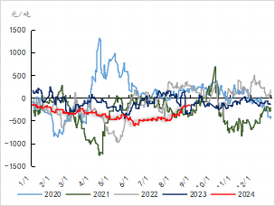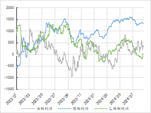 截至2024年8月31日,LLDPE油制利润为380元/吨(+215),煤制利润为1316元/吨(+90),乙烯制利润为20元/吨(+70)。PP油制利润为-88元/吨(+215),煤制利润为940元/吨(+90),丙烯制利润为-115元/吨(+175),MTO利润为-705元/吨(+110),PDH利润为-550元/吨(-155)。