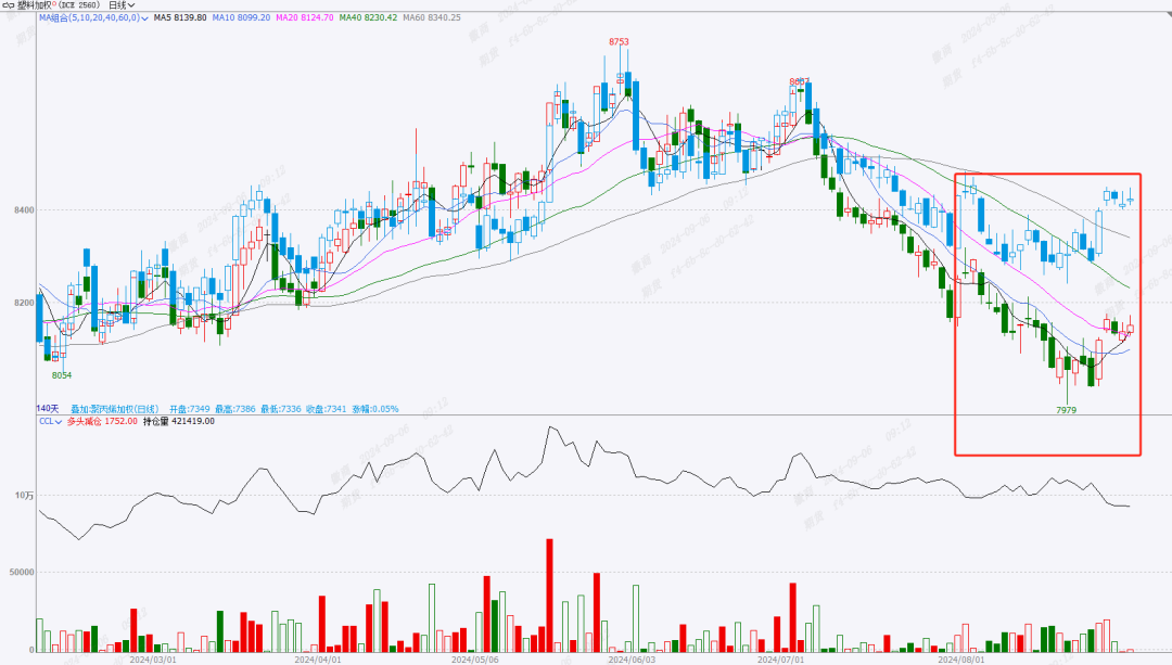 8月份聚烯烃盘面价格先跌后涨,整体呈现“V”型走势。8月初国际油价走弱,成本拖累明显,叠加需求较往年偏弱,且需求有一定的滞后,上游企业累库,市场情绪不佳,导致盘面走弱明显。8月下旬开始,原油价格开始反弹,且市场上PP、PE标品比较紧张,交割逻辑占主导下,对盘面价格形成支撑,且金九银十也逐渐临近,下游需求开始改善,因此盘面价格企稳反弹。