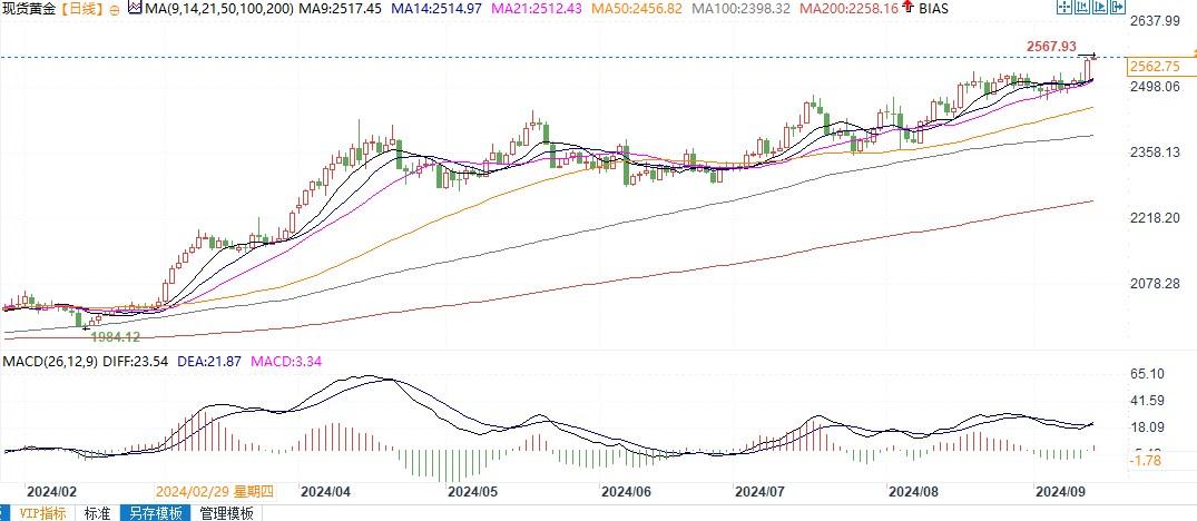 北京时间9月13日9:34,现货黄金报2564.14美元/盎司