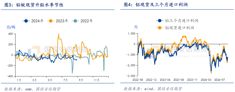 需求方面:SMM统计国内铝下游加工龙头企业开工率维持在62%,线缆头部企业订单充足,铝板带、型材企业有好转迹象,后续开工率有回暖预期。地产政策频出但改善不明显,光伏、新能源汽车、电网维持高增速,海关数据显示7月铝材出口同比增长接近25%,海外需求维持强势。8月铝棒周度产量从32.9万吨回升至34.3万吨,铝表观消费环比6、7月回升,但月度同比增速回落至2%以内,测算1-8月表观消费同比约在5.7%。