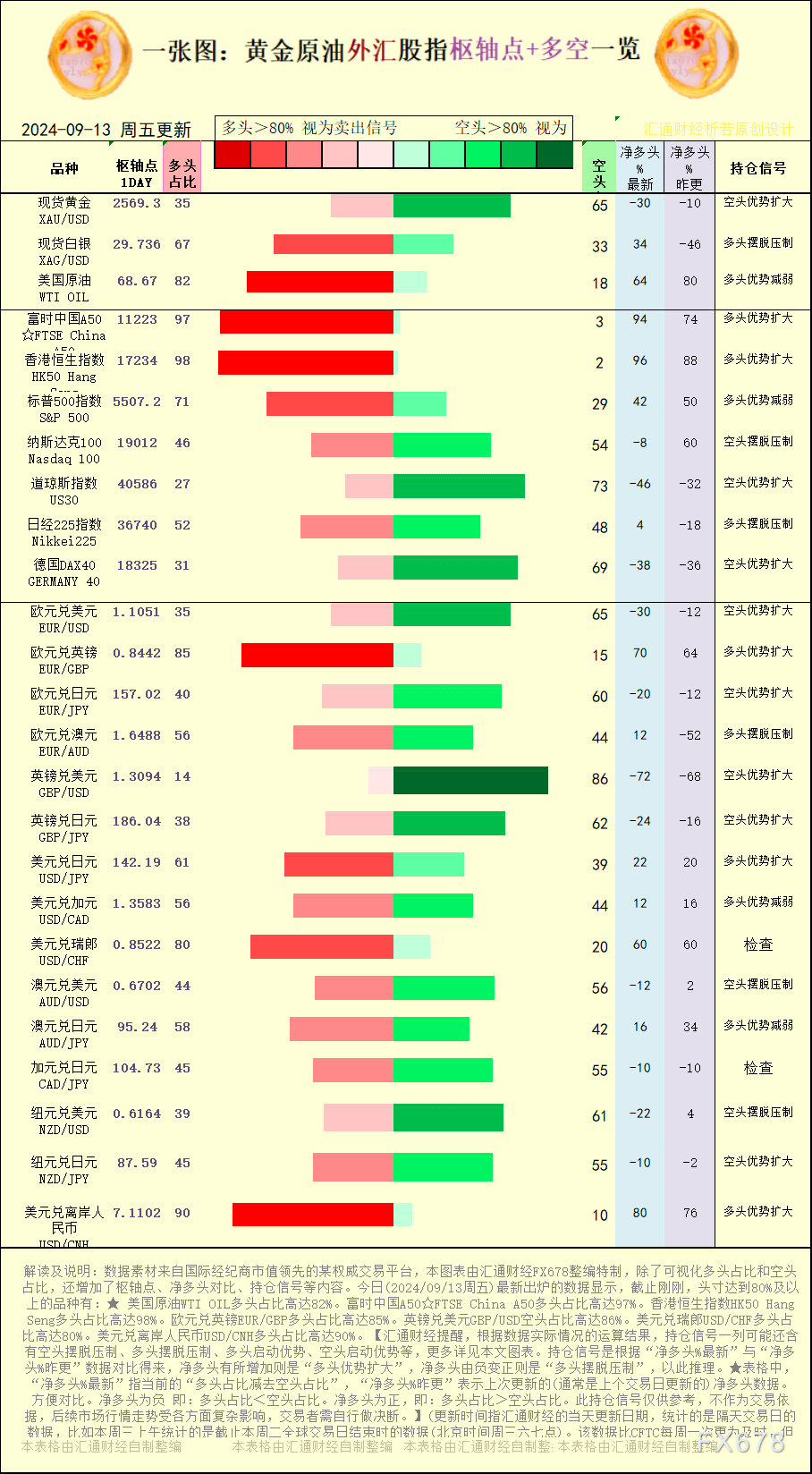 一张图:2024/9/13黄金原油外汇股指“枢纽点+多空持仓信号”一览