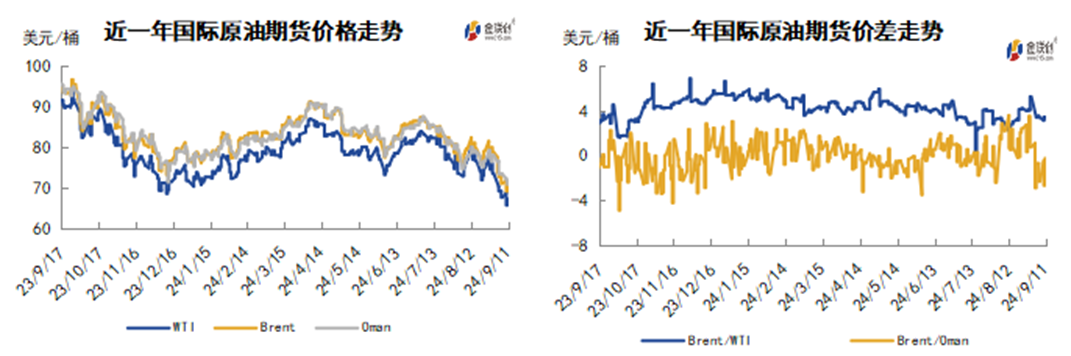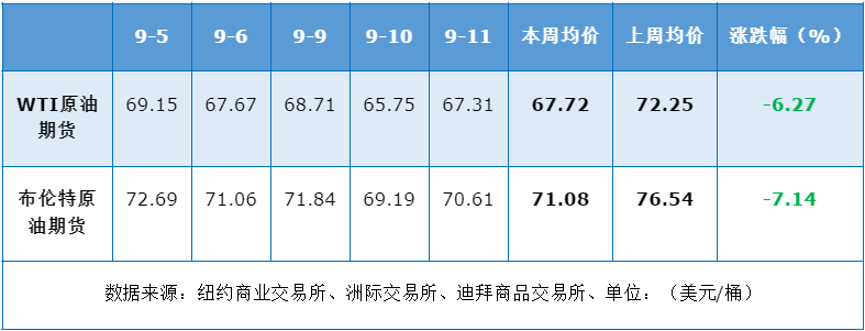 本周(9.5-9.11),原油整体呈现震荡下行的走势,周均价环比下跌。