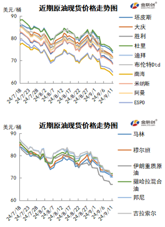 本周,国际原油现货均价环比下跌。中东原油市场方面,因担心亚洲地区需求疲软,沙特已经将10月销售到亚洲地区的阿拉伯轻质原油的官方售价下调至近三年来的最低水平。10月销售到亚洲的阿拉伯轻质原油的官方售价下滑了0.7美元至每桶对阿曼/迪拜均价升水1.3美元。此前接受调查的亚洲炼油商预期阿拉伯轻质原油的下调幅度在每桶0.5-0.7美元之间,一家亚洲炼油厂的消息人士指出,阿拉伯轻质原油的下调幅度比其预期大。此外,卡塔尔能源公司签署标书销售11月装低硫凝析油船货,韩国SK能源等公司参与竞标。不过,其低硫凝析油和脱臭凝析油的销售量可能受到限制,因为其不得不优先供应凝析油给国内凝析油分离塔。卡塔尔能源公司还计划10月至12月上半月将其油田部分检修,因此凝析油的产量可能暂时减少。在这种条件下,韩国的一家能源公司指出卡塔尔能源公司可能不私下谈判销售11月装低硫凝析油和脱臭凝析油。亚太原油市场方面,因购买兴趣疲软,10月装越南原油的现货价差下跌。越南PV OIL销售翠鸟的标书开标,该标书销售一船30万桶11月16-20日装翠鸟船货。标书有效期至9月17日。当前10月装翠鸟原油的现货价差下跌至每桶对即期布伦特升水6美元,10月装翠鸟原油的交易价可能在每桶对即期布伦特升水6美元左右。