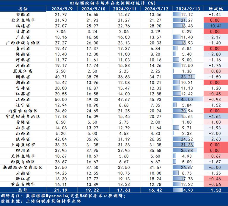 Mysteel调研:9月13日旧标螺纹钢市场库存比例日度调研追踪(分省份)