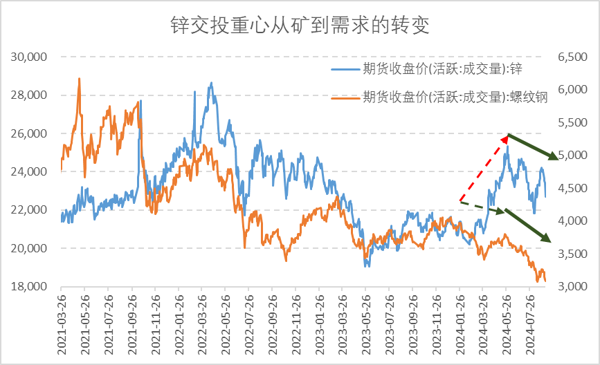 锌矿供应历史性的短缺在2024H2开始向国内炼厂减产有效过渡,锌和黑色走势再次趋同,这意味着矿紧的边际影响下滑,需求的边际影响上升。