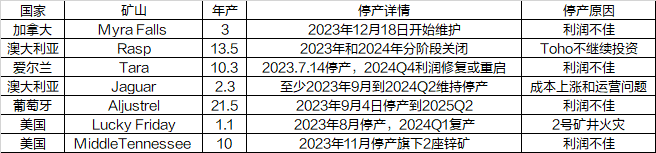 前期停产的矿山中除了产能较小的Lucky Friday于2024Q1复产外,其他的停产时间基本覆盖2024H1,且停产矿山中不乏年产量在10万吨以上的矿。虽然矿山利润较好,但是从目前的信息看2024年Q4复产确定性较大的只有Tara矿。具体如下: