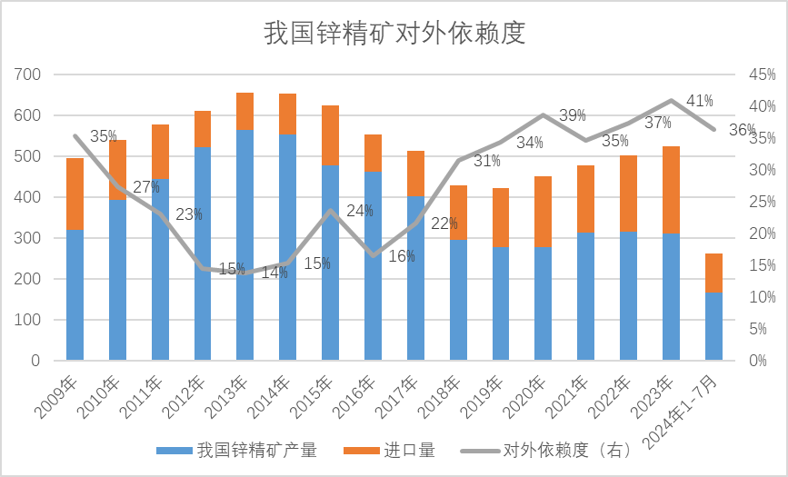 1:由于前期资本投入不足,国内锌矿产量在2013见顶回落,已经有10年未见明显增长,锌精矿对外依赖度接近40%,锌冶炼产能过剩,炼厂议价能力不足,矿的定价权依然在海外。2024H1海外炼厂复产和国内炼厂抢矿,进口矿流入不足,下半年及时俄罗斯的OZ矿所产锌矿完全供应国内,也只有不足11万金属吨的量,而2024年1-7月锌精矿进口同比下滑量折26.5万金属吨,8-12月锌精矿的进口量仍难以给到同比增长预期。