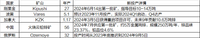 2023年底预期的新投矿山实际达产进度和供应量均不及预期,重点项目包括、Kipushi、Ozernoye、Vares和火烧云铅锌矿,虽然Kipushi投产时间从2024Q3提前到了2024年5月,但6月14日才出了第一批矿,对2024H1锌精矿产出贡献极小,矿石还存在含镉量高的问题;火烧云铅锌矿平均5600米,2024年7月才出第一批矿,折约5万金属吨锌,尚且存在氧化矿技术匹配度低的问题;Vares原本预计2023年11月投产,实际推迟到2024年Q1投产,要等到2024年Q4才达产;而Ozernoye的投产时间从2024年年初推迟到2024年9月4日,计划2025年满产达到53%锌精矿产量60万吨,50%铅精矿产量8.2万吨。