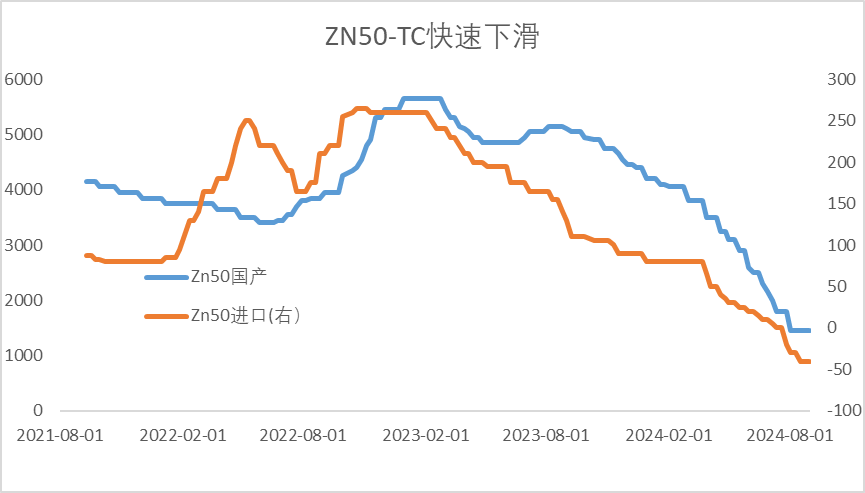 综合以上因素,虽然2024H1炼厂利润不断压缩,海外炼厂依旧积极复产,而国内炼厂减产推迟到下半年才大面积展开。据ILZSG数据,上半年全球精炼锌产出889.7万吨,较去年同期的890万吨仅下滑1万吨,进一步加剧了矿的紧缺,TC一路下滑,冶炼厂单吨冶炼净亏损超1500元。
