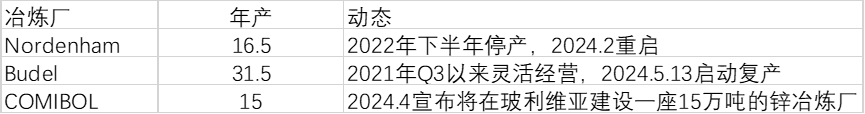 2024H1市场押注降息、对绿色能源拉动需求的预期仍存,市场对锌价后市偏乐乐观。欧洲能源危机解除,部分国家给炼厂以能源价格补贴,欧洲炼厂进一步复产。个别国家增强本国的供应能力,积极引入海外资本和技术在本国投建冶炼厂。TECK和KZ签订的长单TC165美元/矿吨,虽然处于2022年以来最低位,但长单冶炼依然有利可图。部分炼厂的原料自给率较好,整体利润尚可。检修成本高,炼厂不会一亏损立刻检修,往往遵循淡季检修的原则。