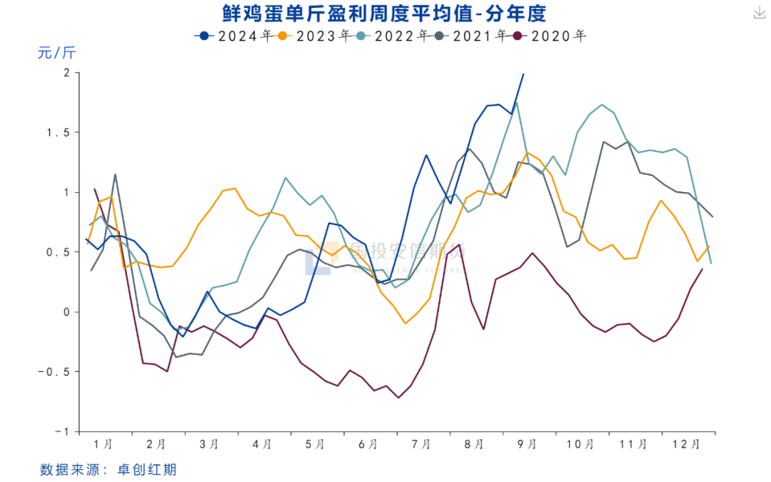 蛋鸡养殖行业在2020年经历亏损后,自2021年至今,行业养殖利润持续为正。行业持续积累现金流,同时在良好的养殖利润驱动下,2023年至今行业鸡苗补栏持续向好,产能不断上升。同时,2023年至2024年饲料养殖成本大幅走弱。预计在供应端不断增加的压力下,鸡蛋见到季节性高点后将再度步入熊市下跌周期,明年蛋鸡养殖行业或进入亏损周期。