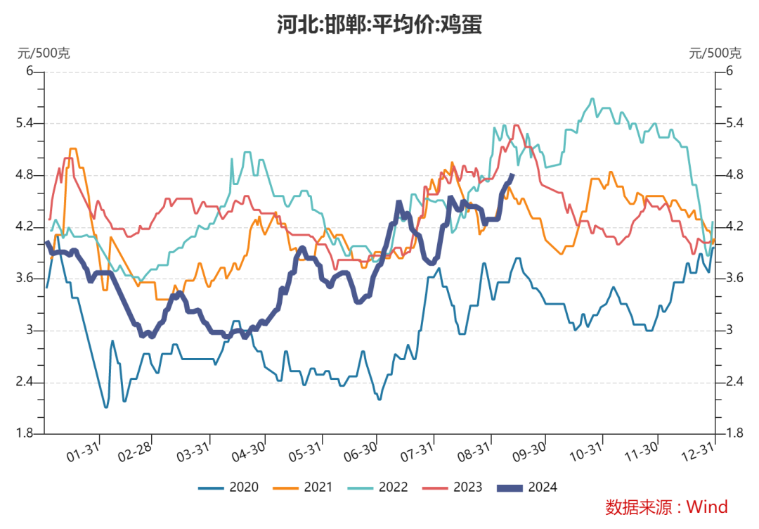 随着中秋节的临近,鸡蛋现货价格正逐步接近季节性高点,或已处在季节性高点附近。全国主产区均价以及河北邯郸目前的鸡蛋现货价格仅次于2022年及2023年同期水平。