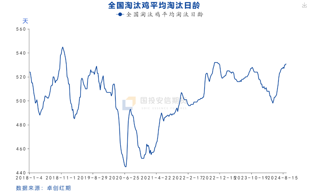 中秋前后,往往是老鸡集中淘汰的时间节点。不过今年由于行业利润高,老鸡淘汰进度一直偏慢,淘汰日龄不断上升。截止9月12日,老鸡淘汰日龄531天,去年同期521天,2022年及2023年老鸡淘汰日龄最高分别为532及528天。后期要关注老鸡淘汰情况,以及对当期供应的影响。