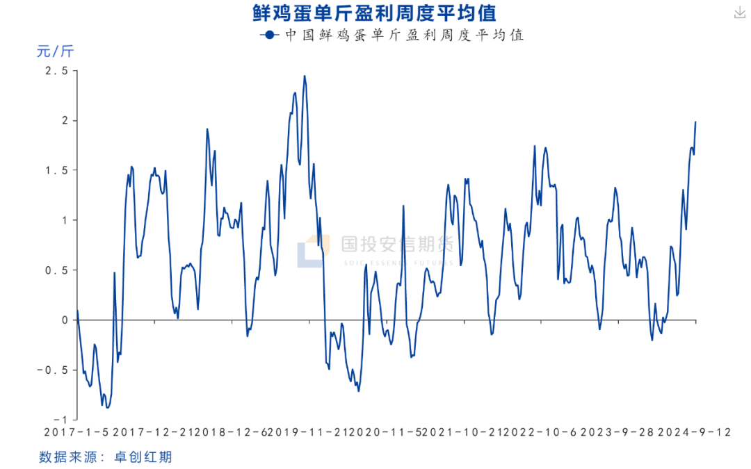 目前蛋鸡养殖利润处在历史高位,仅次于2019年的历史最高水平。卓创数据显示,截止9月12日,鸡蛋单斤盈利周度平均值1.99元/斤,历史最高为2019年10月31日2.45元/斤(卓创统计的鸡蛋单斤盈利计算方式为鸡蛋价格减去饲料成本和0.2元/斤的水电成本,未扣除人工兽药设备折旧成本)。预计高利润将继续刺激养殖端鸡苗补栏积极性。