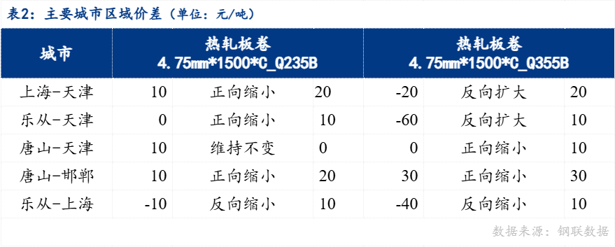 从区域价差来看,4.75mm普卷华南与华北价差0元/吨,华东与华北价差10元/吨,华南与华东价差-10元/吨。京津冀地区价差来看,唐山与天津价差10元/吨,唐山与邯郸价差10元/吨 。