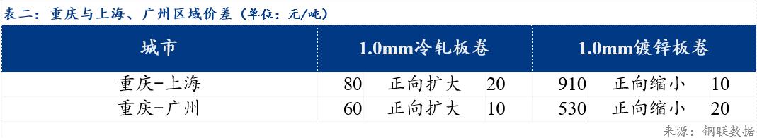 重庆、上海地区冷轧板卷区域价差扩大20元/吨;重庆、广州冷轧板卷区域价差扩大10元/吨。重庆、上海镀锌板卷区域价差缩小10元/吨;重庆、广州镀锌板卷区域价差缩小20元/吨。镀锌、冷轧品种价差维持不变;镀锌、热轧品种价差缩小20元/吨;冷轧、热轧品种价缩小20元/吨。