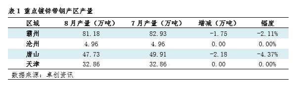 9月进入传统旺季,下游需求存在季节性改善预期,业内偏空情绪或有所缓解,镀锌带钢行情表现或较8月出现改善,镀锌带钢生产企业开工积极性预计增加,行业整体开工率有小幅提升预期,预计9月镀锌带钢产量环比小幅增加,全月总产量在188万吨左右。