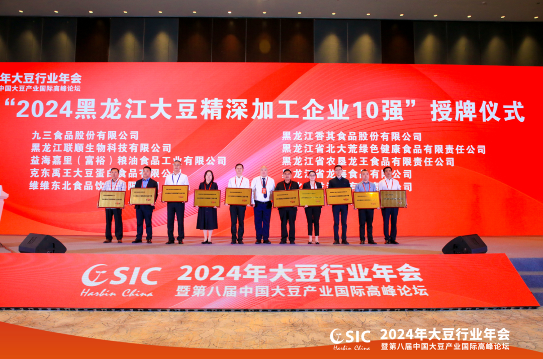 为推动黑龙江省大豆产业高质量发展,引导大豆加工企业晋位争先,大会推出了“2024黑龙江大豆油脂企业10强”和“2024黑龙江大豆精深加工企业10强”。中国大豆产业协会执行会长、黑龙江省大豆协会会长唐启军为10强企业授牌。