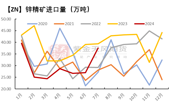 2024年7月中国进口锌精矿37.54万实物吨,同比减少4.70%,环比增加39.29%;2024年1-7月累计进口锌精矿209.05万实物吨,累计同比下滑21.77%。