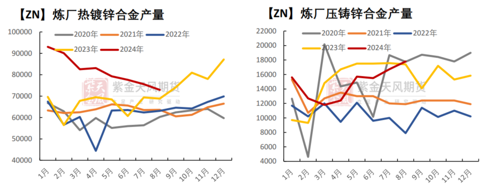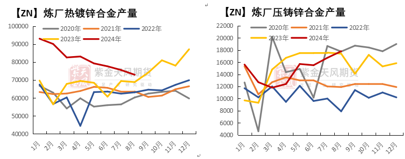 从供应端来看,8月21日,中国锌原料联合谈判(协调)小组(CZSPT)季度会议在内蒙古巴彦淖尔召开,各方协定联合减产的事项,国内14家锌骨干企业主要负责人到会。会议结果由安泰科发布,生产计划调整后,与年初预期相比,全年预计将累计减少锌矿需求近百万吨金属量。国内加工费持续低位,推动炼厂减产。
