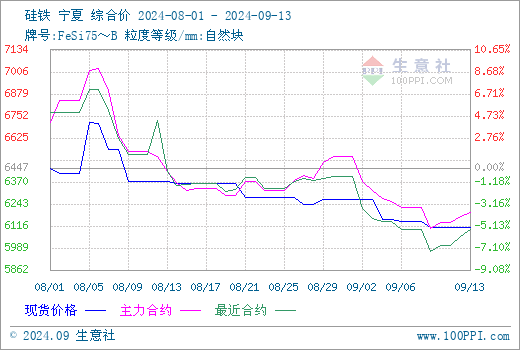 硅铁期货行情震荡下行,再加之市场需求状况迟迟未有明显改善,采购商采购积极性不高,已出台招标价格均呈下跌态势等利空信息“拖累,现业内多数信心一般,整体观望情绪升温,部分实际成交价格小幅调整。据生意社商品行情分析系统,9月14日硅铁(牌号:FeSi75~B;粒度等级/mm:自然块)宁夏地区市场报价在6100-6200元/吨,较周初降0.58%。
