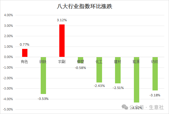 生意社监测的8个行业,本周跌多涨少,上涨前三的分别是有色行业,涨幅为2.09%,钢铁行业,涨幅为1.23%,农副行业,涨幅为0.09%;下跌前三的分别是纺织行业,跌幅为-0.75%,能源行业,跌幅为-0.66%,建材行业,跌幅为-0.53%。