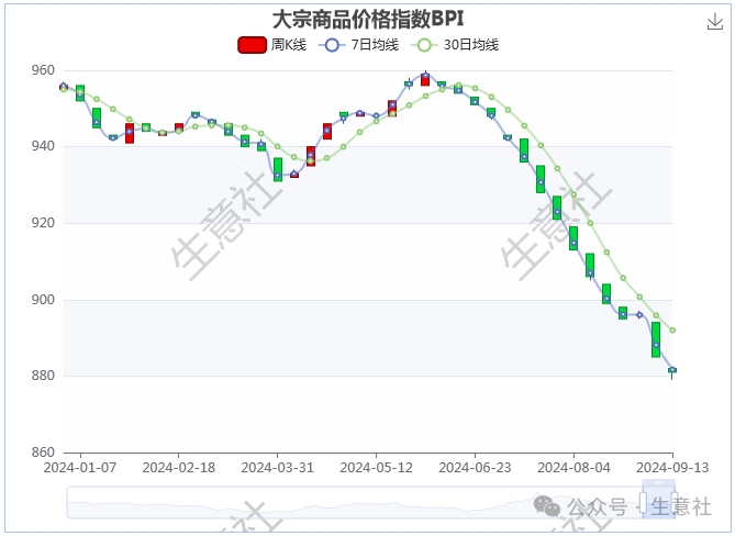 9月13日大宗商品价格指数BPI为881点,较周初下降了1点,较周期内最高点1343点(2021-10-19)下降了34.40%,再创年内新低。