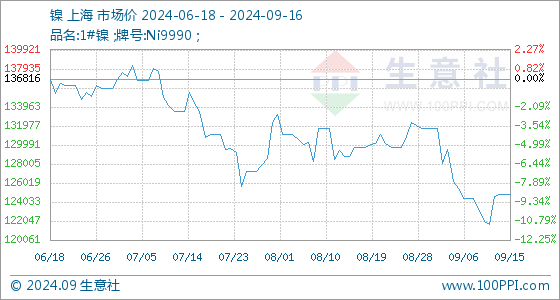 9月16日,生意社镍基准价为124833.33元/吨,与本月初(131666.67元/吨)相比,下降了-5.19%。