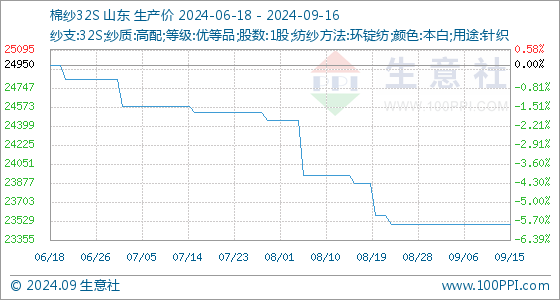 9月16日,生意社棉纱32S基准价为23500.00元/吨,与本月初持平。
