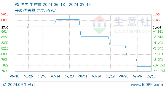 9月16日,生意社PX基准价为7800.00元/吨,与本月初(8050.00元/吨)相比,下降了-3.11%。