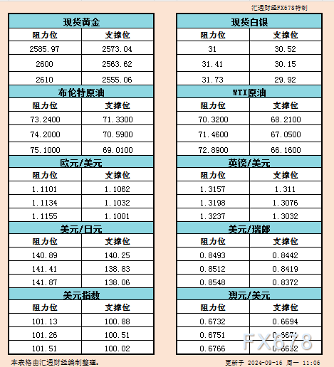 9月16日亚市支撑阻力:金银原油+美元指数等六大货币对
