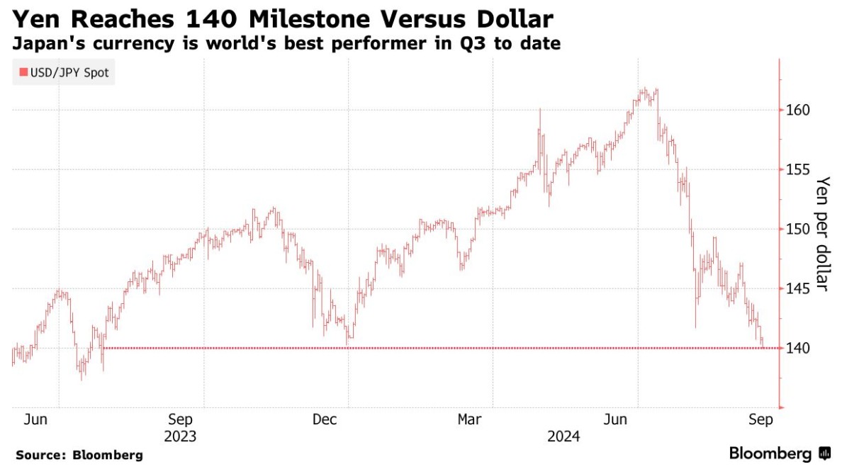 周一,日元兑美元一度升值0.6%,至1美元兑139.96日元,为2023年7月以来的最高水平。日元是本季度表现最好的10国集团货币,由于投资者预期美国和日本之间的利率差距会进一步缩小,日元上涨了15%。