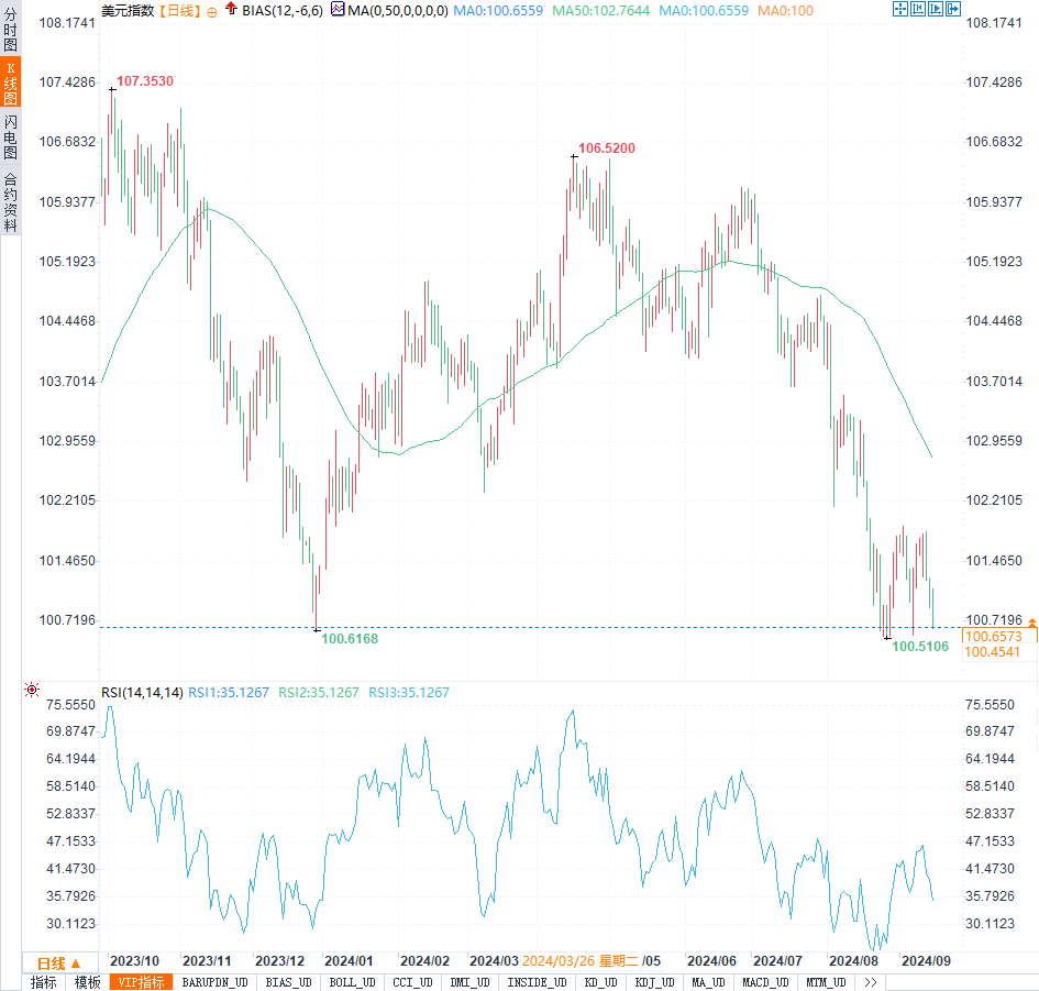 9月16日,美元指数下跌0.3%,接近8月份的低点。如果跌破这一支撑位,美元将创下自1月份以来的最低水平。根据市场动态,彭博美元指数显示美元兑主要货币的整体疲软态势已延续数周,尤其是在市场对美联储进一步宽松政策的预期持续加重的背景下。