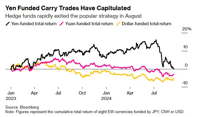 随着日本央行7月加息,大量借入日元并将现金投入到高收益资产中的交易员被迫迅速平仓。这些剧烈波动波及到其他资产,并引发了人们对金融体系中杠杆水平的担忧,这让交易员猜测市场上是否还会有更多杠杆。