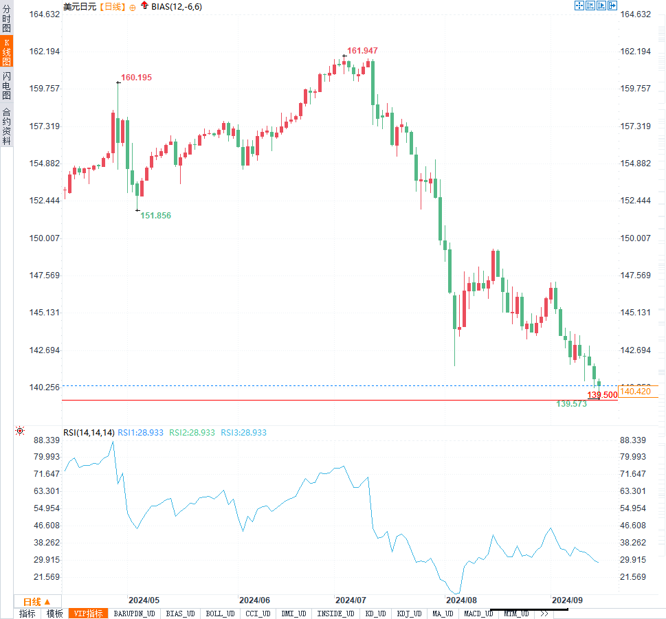 汇通财经APP讯——北京时间2024年9月16日,美元兑日元继续走低,盘中一度触及139.58的低点,为一年多来的最低水平,延续了此前的跌势。回顾过去几日,美元兑日元自12月以来持续承压,美元指数也下跌0.3%至100.67。随着市场参与者密切关注本周美联储、英国央行和日本央行的政策决议,美元兑日元的短期走势显得扑朔迷离。