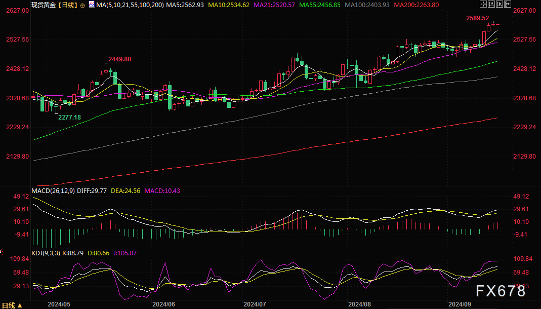 虽然高位出现了一些短线多单的获利了结,但金价收盘仍守在历史高位附近,周一收报2589.89美元/盎司。