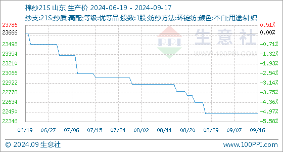 9月17日,生意社棉纱21S基准价为22466.67元/吨,与本月初持平。