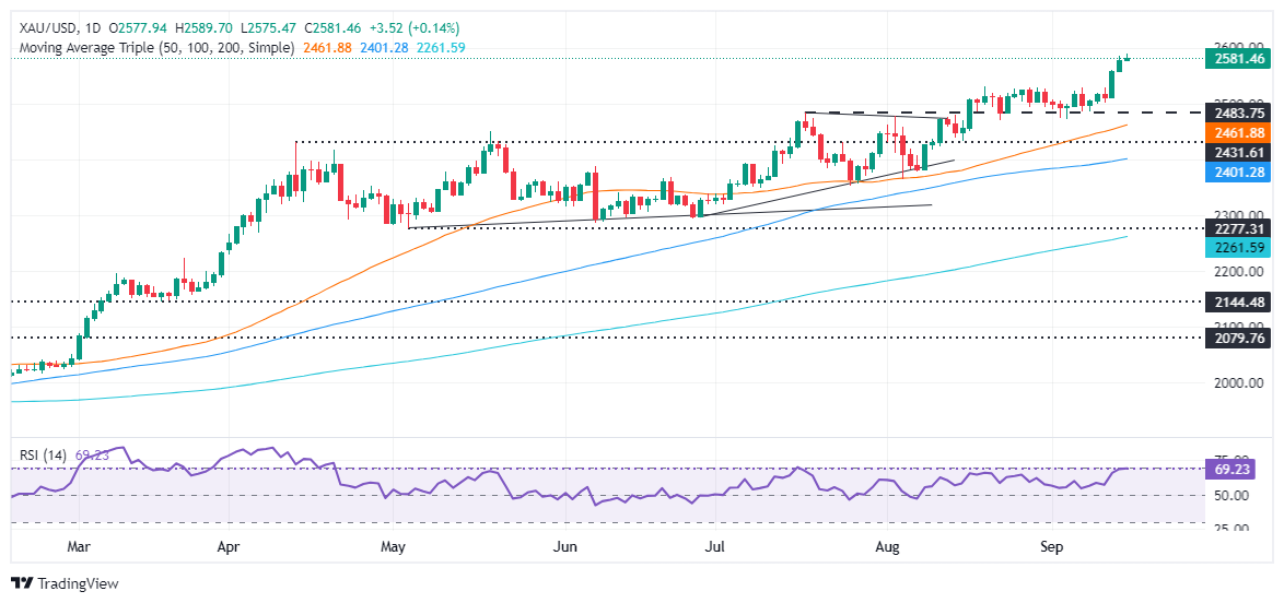现货黄金周一收盘上涨0.14%,报2582.34美元/盎司;金价盘中最高触及2589.68美元/盎司,刷新纪录高位。
