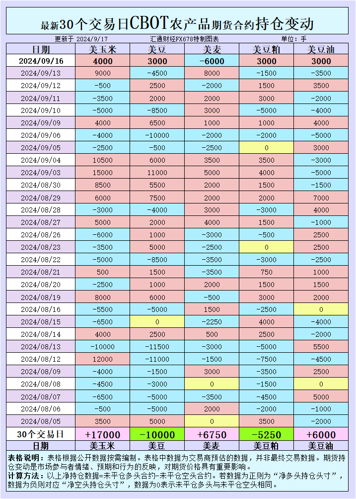 增加CBOT玉米投机性净多头;增加CBOT大豆投机性净多头;增加CBOT小麦投机性净空头;增加CBOT豆粕投机性净多头;增加CBOT豆油投机性净多头。