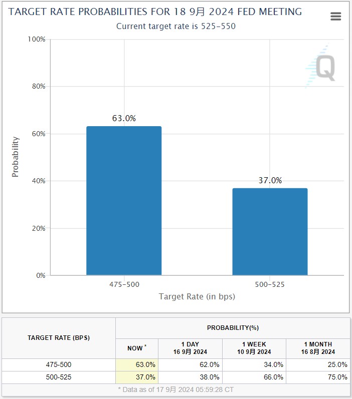 CME的Fed watch工具显示,市场目前预计美联储将在本周的会议上降息25个基点的可能性为37%,降息50个基点的可能性为63%。