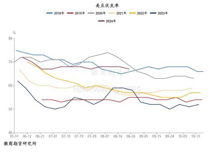 目前大豆优良率符合市场预期,截至8月25日,优良率为67%,大豆结荚比例为89%,整体生长状况良好,9月进入收割季,天气窗口临近关闭,即使有不利天气干扰,但基本不会改变美豆增产的基本格局。