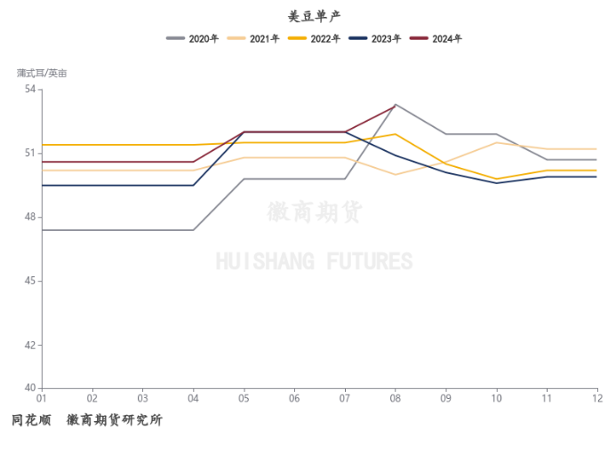 1. 8月USDA报告对美国大豆单产预估为53.2蒲式耳/英亩,收获面积调增100万英亩,导致产量预估为45.89亿蒲式耳,同比增产10%。Pro Farmer机构预计美国大豆平均单产为54.9蒲/英亩,产量为47.4亿蒲。