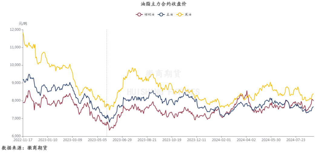 8月份油脂呈现先抑后扬走势,豆油和菜油2501合约小幅下跌0.49%、2.1%,棕榈油2501合约上涨4.36%,棕榈油与豆菜油价差进一步走缩。