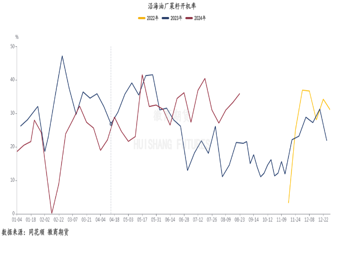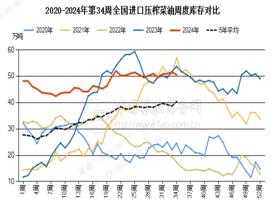 国内菜油供需持续宽松,据海关数据显示7月菜籽进口40.6万吨,同比增25.8万吨,1-7月累计进口283万吨,同比下降19.6%。7月菜油进口11.5万吨,环比下降6%,累计进口105万吨,同比下降19.7%。虽然上半年菜籽与菜油进口同比下降,但是需求更为低迷,导致菜油库存持续高企,截至第34周末菜油库存量为50.6万吨,较上周环比下降1.9%,处于近5年历史最高位。