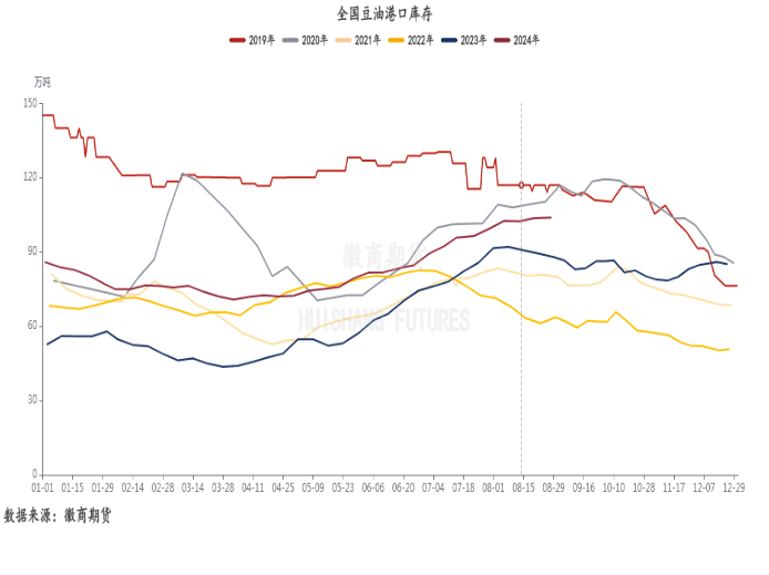 近期棕榈油进口利润好转,企业棕榈油进口买船增多,船期监测显示,8-10月我国棕榈油到港量预计分别为30万吨、36万吨和42万吨。8月23日,国内棕榈油库存升至59万吨,仅较去年同期下降7万吨,目前10-12月船期采购尚在进行,考虑到东南亚棕榈油持续增产,阶段性出口压力下我国棕榈油进口利润有望好转,进而促使国内买船增多,棕榈油供应逐渐宽松。