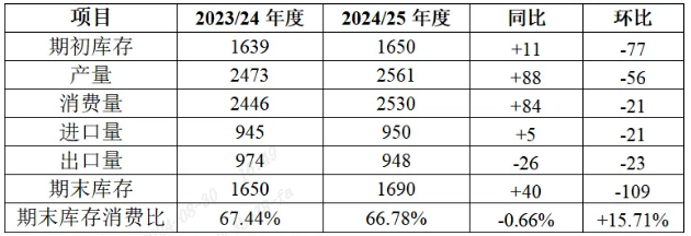 今年北半球棉花播种顺利且长势良好,市场对全球棉花增产预期较强。目前距棉花采摘还有一个月左右,这段时间的天气变化及其对棉花产量的影响需密切关注。据美国农业部8月预测,2024/25年度全球棉花产量2561万吨,同比增加88万吨;棉花消费量2530万吨,同比增加84万吨。